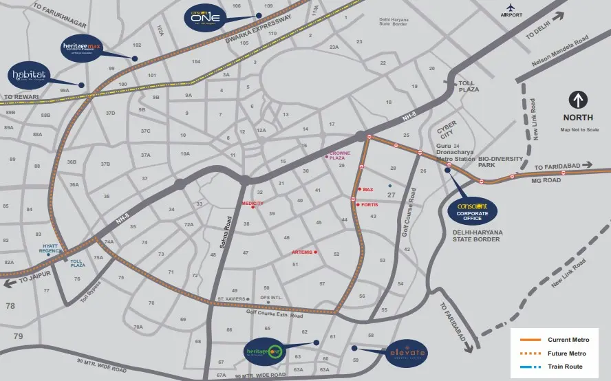 Sector 109 Gurgaon sits along the Dwarka Expressway corridor, a major growth route linking Gurgaon with Delhi and other infrastructure zones. Conscient One benefits from this location because access toward the Delhi border, Dwarka and IGI Airport improves its practical value for both businesses and visitors. As connectivity in this corridor strengthens further, the address continues to gain importance within Gurgaon's broader commercial map.