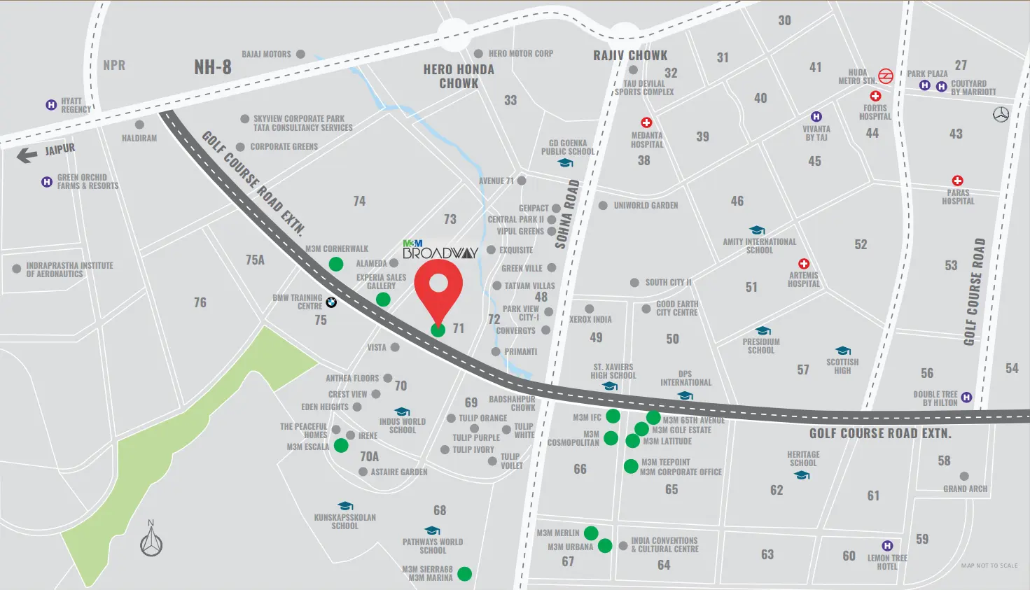 Sector 71 Gurgaon is positioned near Southern Peripheral Road and NH-48, two important connectivity corridors that improve movement across key parts of the city. M3M Broadway benefits from this location because easier access supports both local consumer movement and a wider catchment across Gurgaon. This strengthens the project's practicality as a retail and leisure destination while also supporting long-term market visibility.