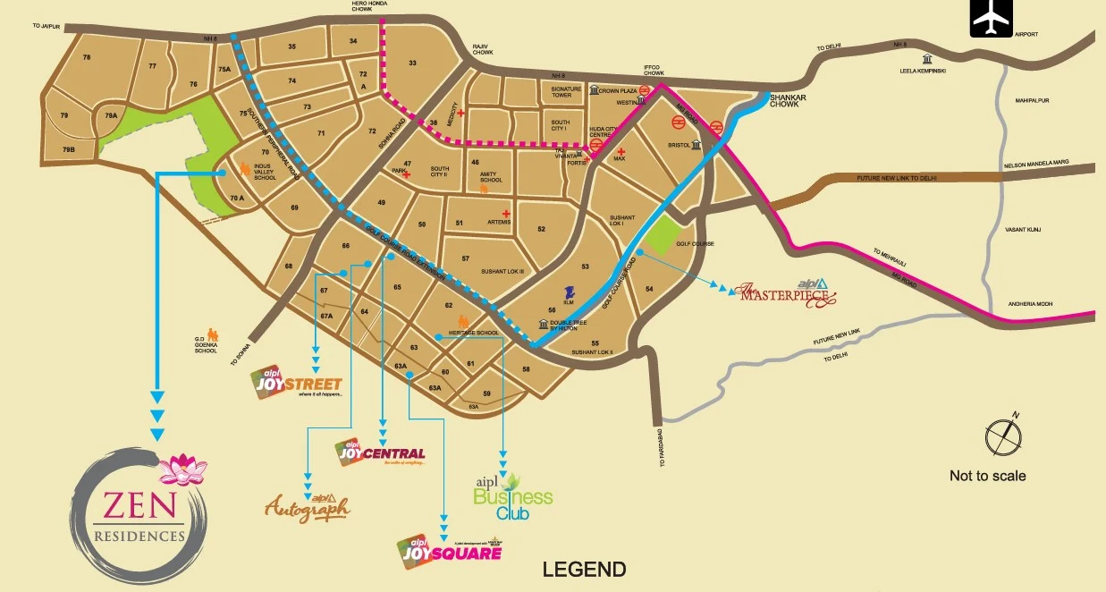 AIPL Zen Residences Sector 70A enjoys a strong location advantage due to its connectivity and developed surroundings. The project is close to Southern Peripheral Road (SPR), which connects smoothly to Sohna Road, NH-48, and other major parts of Gurgaon. Daily necessities such as schools, hospitals, shopping areas, and office spaces are located nearby.